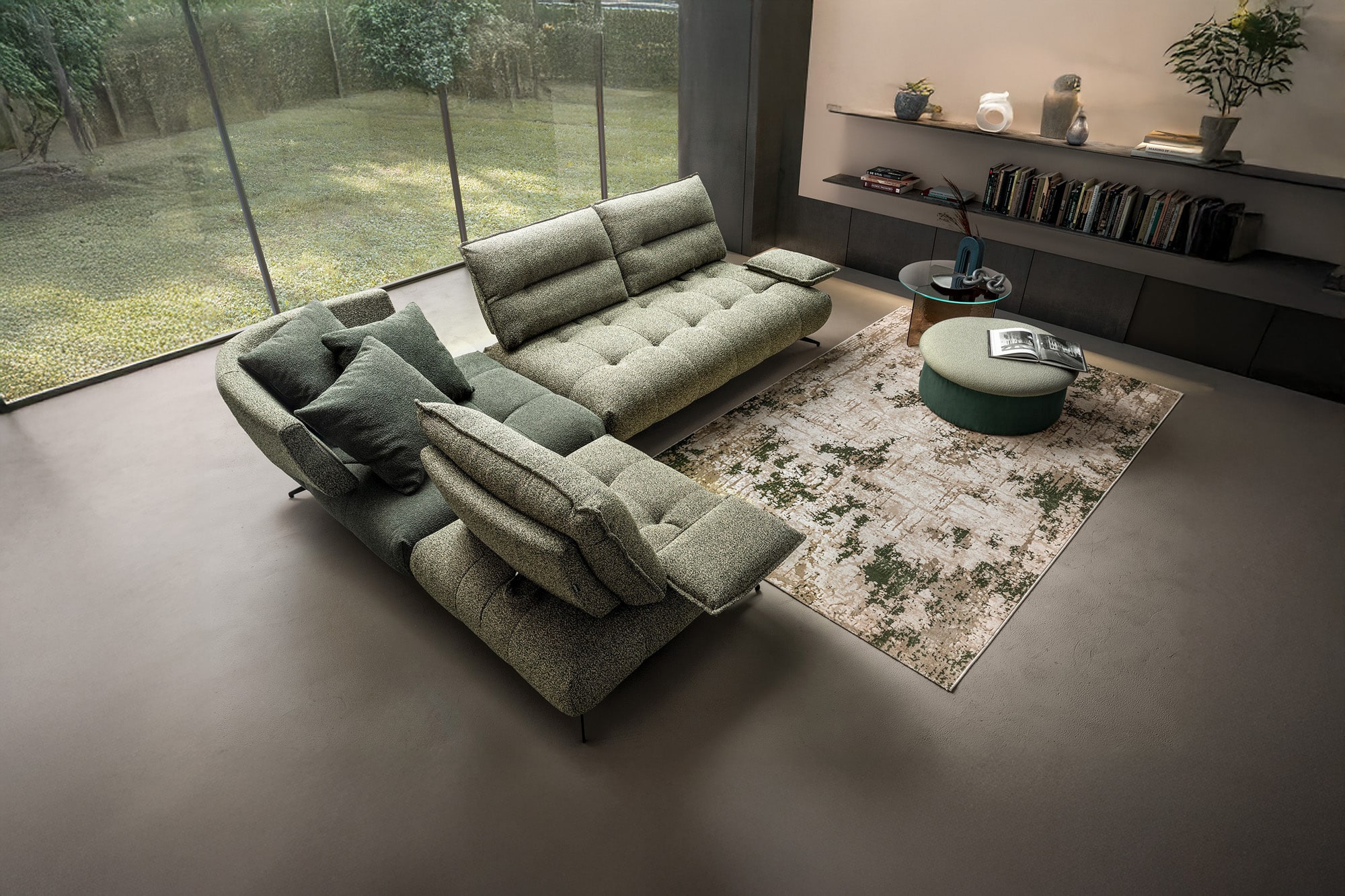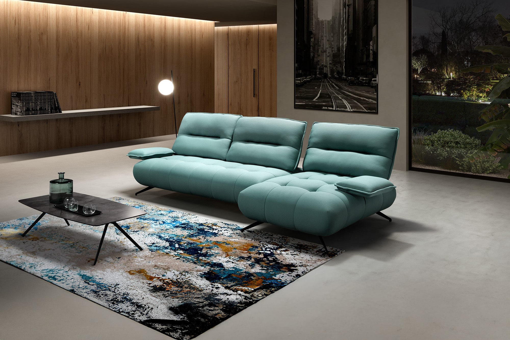 Il bracciolo traslante del divano offre versatilità e comodità, permettendo di personalizzare la posizione per un relax ottimale.