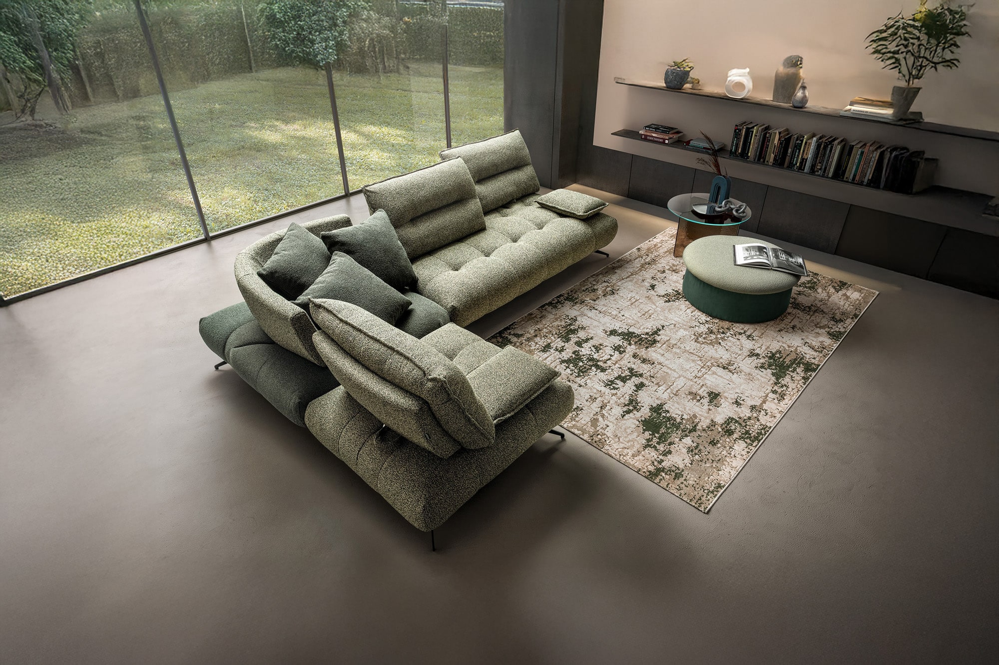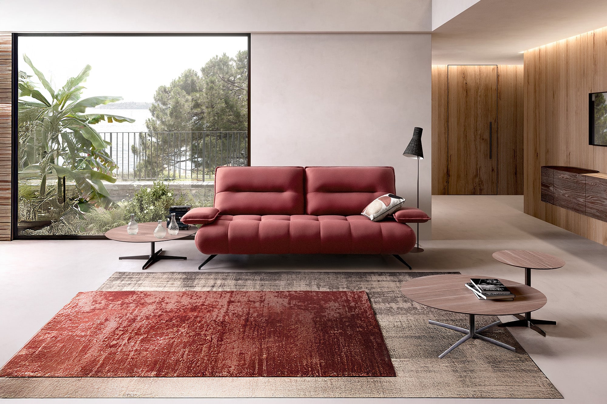Realizzabile in microfibra o tessuto e in una vasta gamma cromatica, Arona si distingue per la sua contemporaneità, che dona un tocco originale alla zona living.