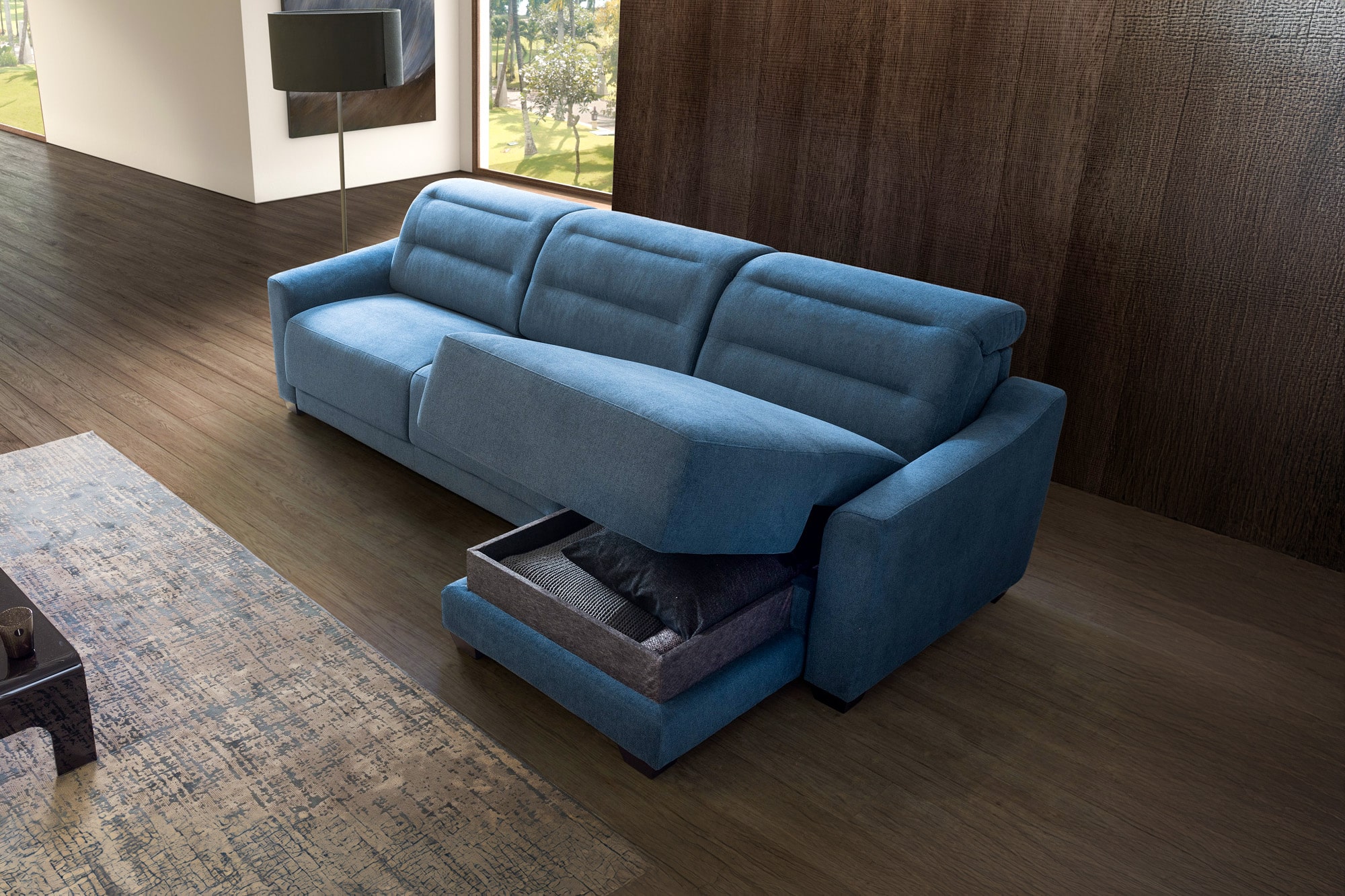 La funzione letto e la chaise longue con contenitore creano una soluzione versatile che unisce comfort e funzionalità, perfetta per ogni ambiente. Inoltre, i poggiatesta reclinabili migliorano l'esperienza sia in posizione di seduta che di riposo.