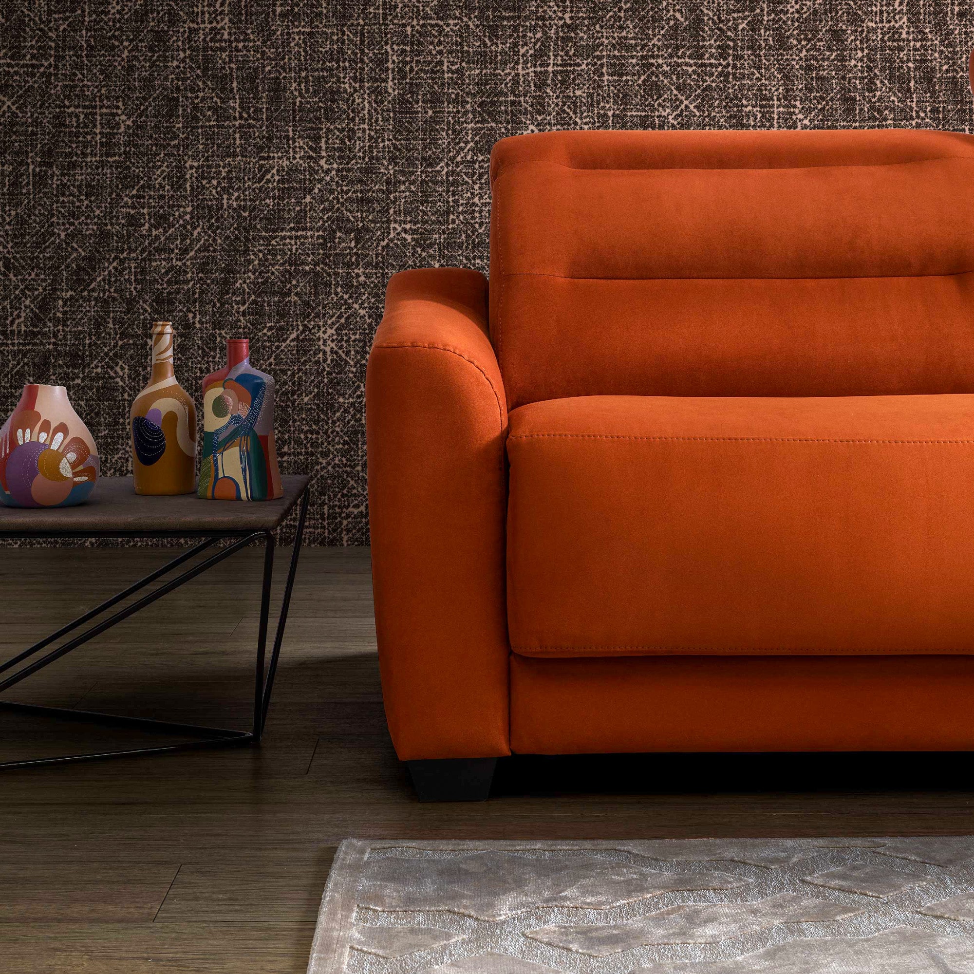 Il cuscino di seduta vanta un carattere forte esaltato da contorni eleganti e da un'importante altezza, mentre il bracciolo, dall'estetica semplice ma sofisticata, presenta un profilo inclinato che scende nella​ parte frontale e dona al divano un tocco di calore irrinunciabile.