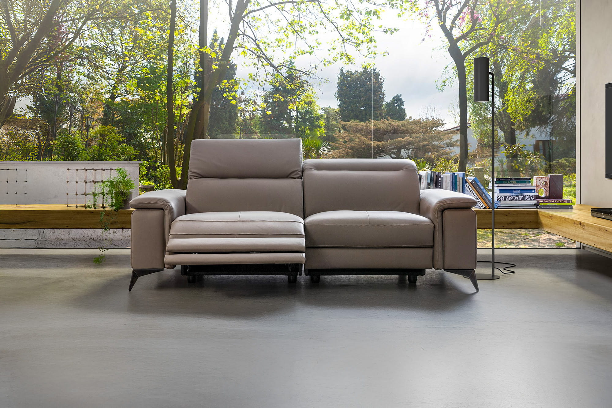 Il bracciolo, dalla forma ampia e squadrata, ospita un morbido sovrabraccio che si integra armoniosamente nella struttura, creando una silhouette moderna e accogliente e un equilibrio visivo perfetto.